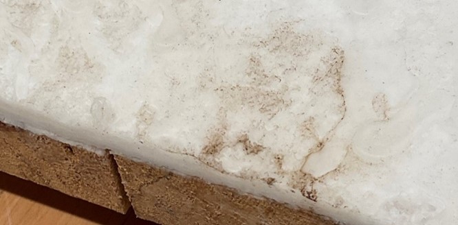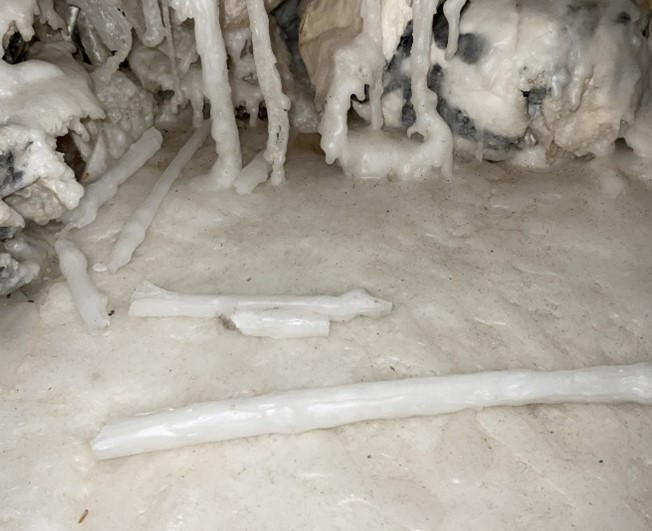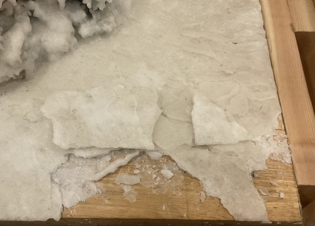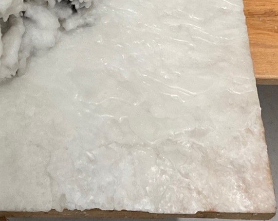 Upon arrival at the museum, Calligraphy Waterfall was not in a state to achieve its full potential and purpose as a work of art. There was extensive damage to the wax base at each of the four corners and severe breakage of the fragile drip details. The once diaphanous, white surface was obscured by cobwebs, grime, discoloration, and even remnants of dried leaves, perhaps original to the initial 2003 installation. All of which, of course, takes away from the intention of the work and no longer lets the viewer “observe the inner qualities of the object(s).”