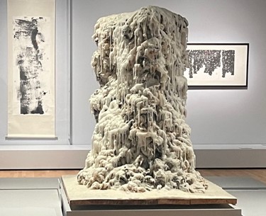 Calligraphy Waterfall, a 5 ½-foot-tall sculpture, comprised of pieces of mulberry paper, ink, and candlewax, arrived at the museum in 2020 in a damaged state. Originally created in 2003 as part of an installation by the conceptual artist collective the Yangjiang Group, headed by Zheng Guogu, the work is now featured as the meditative centerpiece for the Chinese art gallery of the permanent collection of Arts of Asia (5th floor of the Martin Building). Layers of dripped wax cascade down a pile of crumpled, traditional mulberry paper that was brushed with ink. The visually stunning sculpture is reminiscent of gentle waterfalls often featured in traditional Chinese ink painting.