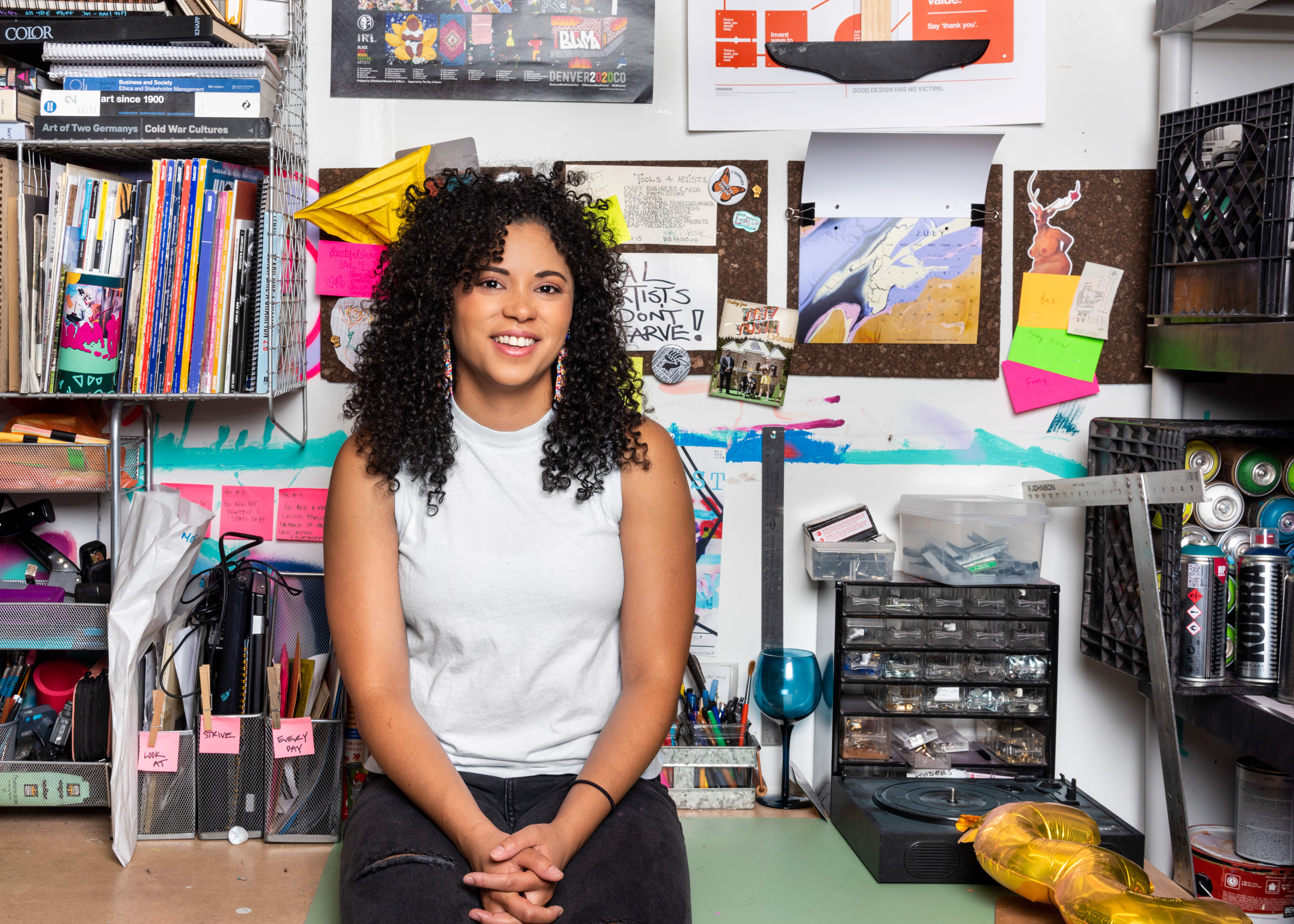 Moe Gram is a multidisciplinary artist living and working in Denver and uses a diverse array of media including painting, mural, collage, and installation. Gram graduated from California State University Bakersfield with a major in Visual Arts and a minor in Cultural Studies. Currently, Gram's art can be seen in murals throughout Colorado, an installation at the Denver Art Museum's Creative Hub, at the Acoma House in room 204, and at various locations throughout the Denver metro area. Through her playful color palette, messaging, and juxtaposition of unique embellishments and found objects, Moe’s work encourages the viewer to absorb and reflect- for the betterment of oneself and collectively for us all.