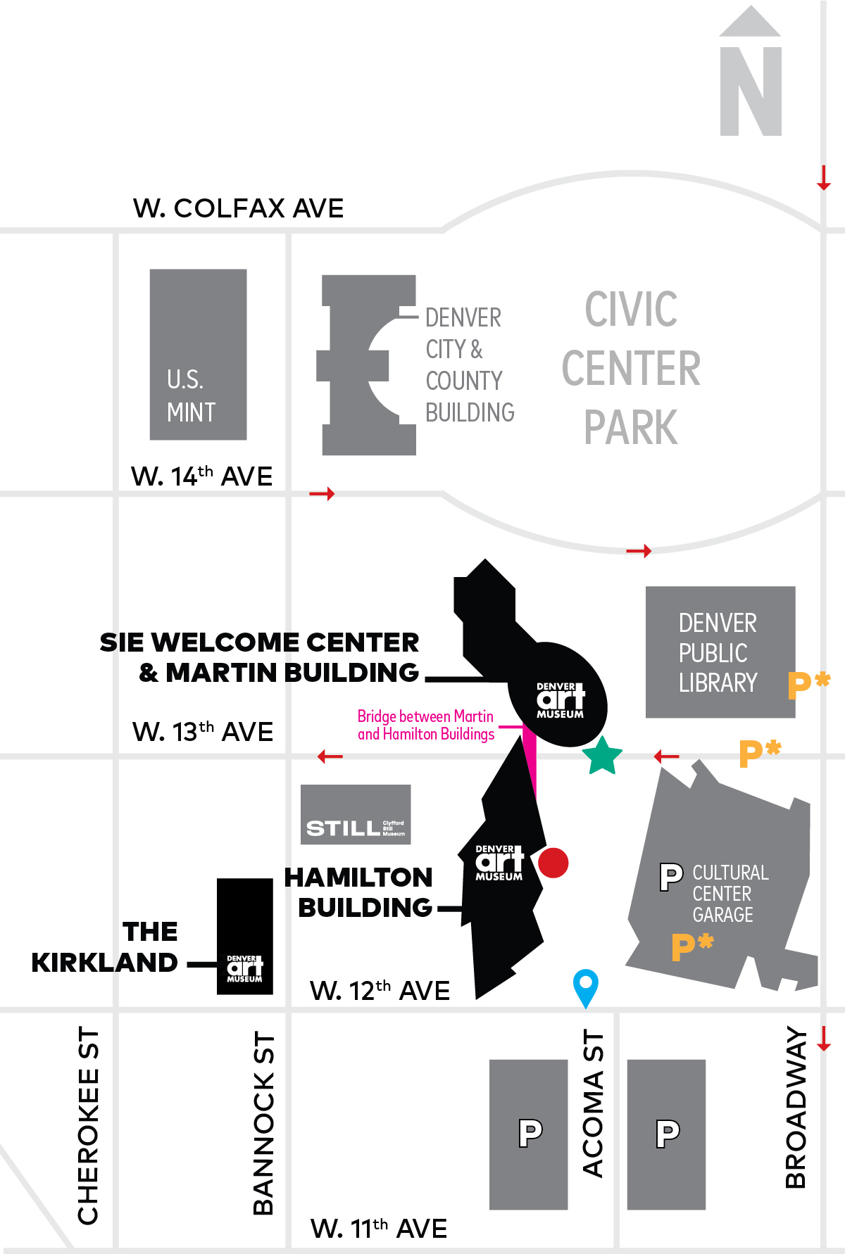 The museum is located at 100 W. 14th Avenue Parkway in Denver's Golden Triangle neighborhood. You may enter through either the Hamilton Building or the Martin Building. Entry to the Kirkland Museum (1201 Bannock Street) is now included with Denver Art Museum general admission.